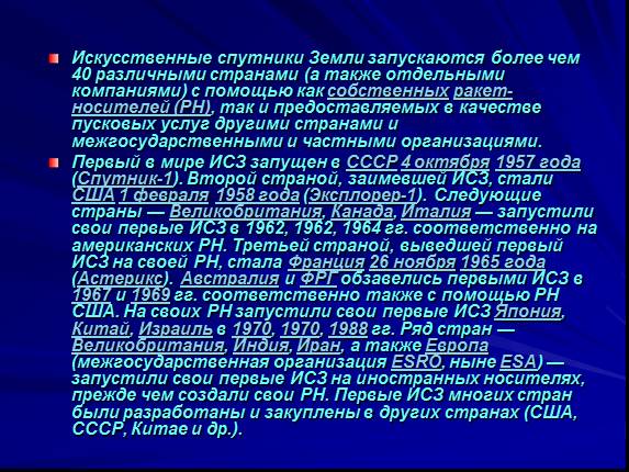 Искусственные спутники Земли запускаются более чем 40 различными странами (а также отдельными компаниями) с помощью как собственных ракет-носителей (РН), так и предоставляемых в качестве пусковых услуг другими странами и межгосударственными и частными организациями.
