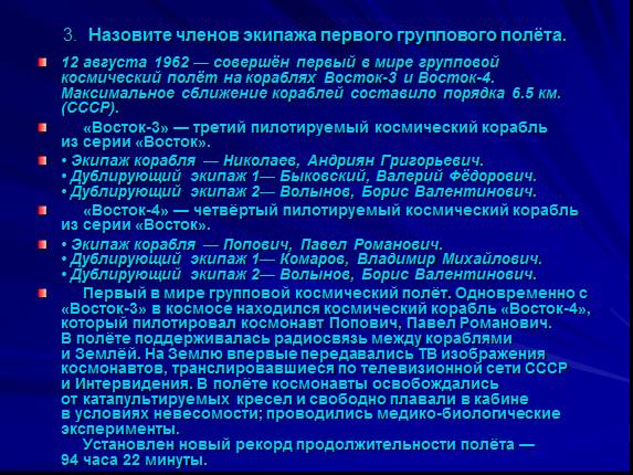 Первый в мире групповой космический полёт. Одновременно с «Восток-3» в космосе находился космический корабль «Восток-4», который пилотировал космонавт Попович, Павел Романович. В полёте поддерживалась радиосвязь между кораблями и Землёй. На Землю впервые передавались ТВ изображения космонавтов, транслировавшиеся по телевизионной сети СССР и Интервидения. В полёте космонавты освобождались от катапультируемых кресел и свободно плавали в кабине в условиях невесомости; проводились медико-биологические эксперименты. Установлен новый рекорд продолжительности полёта — 94 часа 22 минуты.