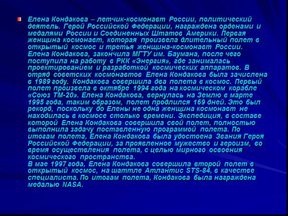 Елена Кондакова – летчик-космонавт России, политический деятель. Герой Российской Федерации, награждена орденами и медалями России и Соединенных Штатов Америки. Первая женщина космонавт, которая произвела длительный полет в открытый космос и третья женщина-космонавт России. Елена Кондакова, закончила МГТУ им. Баумана, после чего поступила на работу в РКК «Энергия», где занималась проектированием и разработкой космических аппаратов. В отряд советских космонавтов Елена Кондакова была зачислена в 1989 году. Кондакова совершила два полета в космос. Первый полет произвела в октябре 1994 года на космическом корабле «Союз ТМ-20». Елена Кондакова, вернулась на Землю в марте 1995 года, таким образом, полет продлился 169 дней. Это был рекорд, поскольку до Елены не одна женщина космонавт не находилась в космосе столько времени. Экспедиция, в составе которой Елена Кондакова совершила свой полет, полностью выполнила задачу поставленную программой полета. По итогам полета, Елена Кондакова была удостоена Звания Героя Российской Федерации, за проявленное мужество и героизм, во время осуществления полета, с целью мирного освоения космического пространства. В мае 1997 года, Елена Кондакова совершила второй полет в открытый космос, на шаттле Атлантис STS-84, в качестве специалиста. По итогам полета, Кондакова была награждена медалью NASA.