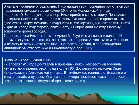 4 апреля 1918 года, уже под вечер, Нико придёт в свою каморку. По случаю праздника Пасхи кто-то напоит его вином. Он ляжет на пол и пролежит так двое суток. Вокруг безмолвно будут стоять его картины, в ящике лежать кисти и краски. Город будет праздновать Пасху. О Пиросмани же будет некому вспомнить кроме Господа…