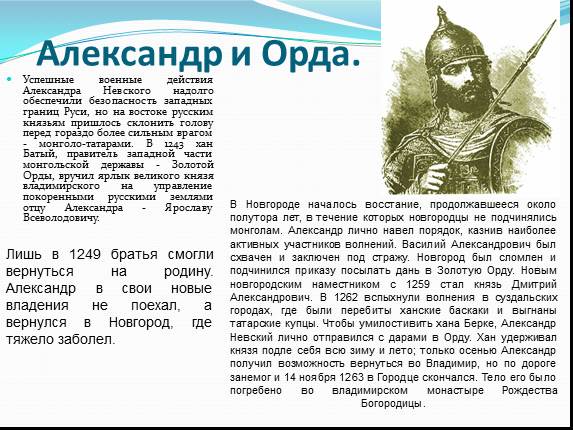 Успешные военные действия Александра Невского надолго обеспечили безопасность западных границ Руси, но на востоке русским князьям пришлось склонить голову перед гораздо более сильным врагом - монголо-татарами. В 1243 хан Батый, правитель западной части монгольской державы - Золотой Орды, вручил ярлык великого князя владимирского на управление покоренными русскими землями отцу Александра - Ярославу Всеволодовичу.