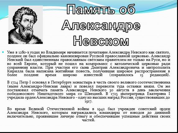 Уже в 1280-х годах во Владимире начинается почитание Александра Невского как святого, позднее он был официально канонизирован Русской православной церковью. Александр Невский был единственным православным светским правителем не только на Руси, но и во всей Европе, который не пошел на компромисс с католической церковью ради сохранения власти. При участии его сына Дмитрия Александровича и митрополита Кирилла была написана житийная повесть, получившая широкое распространение в более позднее время широко известной (сохранилось 15 редакций). В 1724 Петр I основал в Петербурге монастырь в честь своего великого соотечественника (ныне Александро-Невская лавра) и повелел перевезти туда останки князя. Он же постановил отмечать память Александра Невского 30 августа в день заключения победоносного Ништадтского мира со Швецией. В 1725 императрица Екатерина I учредила орден Александра Невского - одну из высших наград России, существовавших до 1917. Во время Великой Отечественной войны в 1942 был учрежден советский орден Александра Невского, которым награждались командиры от взводов до дивизий включительно, проявившие личную отвагу и обеспечившие успешные действия своих частей.