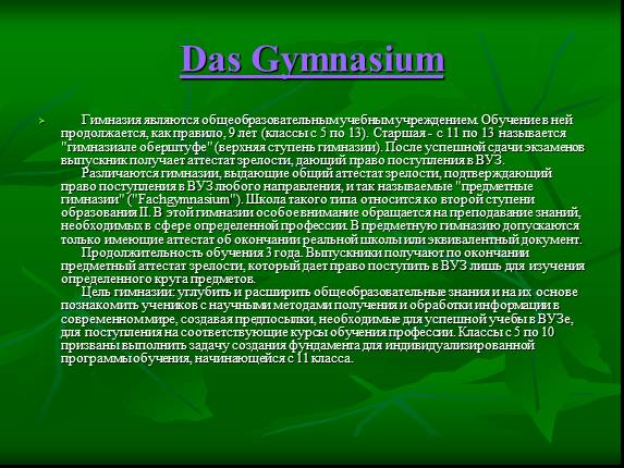 Гимназия являются общеобразовательным учебным учреждением. Обучение в ней продолжается, как правило, 9 лет (классы с 5 по 13). Старшая - с 11 по 13 называется "гимназиале оберштуфе" (верхняя ступень гимназии). После успешной сдачи экзаменов выпускник получает аттестат зрелости, дающий право поступления в ВУЗ. Различаются гимназии, выдающие общий аттестат зрелости, подтверждающий право поступления в ВУЗ любого направления, и так называемые "предметные гимназии" ("Fachgymnasium"). Школа такого типа относится ко второй ступени образования II. В этой гимназии особое внимание обращается на преподавание знаний, необходимых в сфере определенной профессии. В предметную гимназию допускаются только имеющие аттестат об окончании реальной школы или эквивалентный документ. Продолжительность обучения 3 года. Выпускники получают по окончании предметный аттестат зрелости, который дает право поступить в ВУЗ лишь для изучения определенного круга предметов. Цель гимназии: углубить и расширить общеобразовательные знания и на их основе познакомить учеников с научными методами получения и обработки информации в современном мире, создавая предпосылки, необходимые для успешной учебы в ВУЗе, для поступления на соответствующие курсы обучения профессии. Классы с 5 по 10 призваны выполнить задачу создания фундамента для индивидуализированной программы обучения, начинающейся с 11 класса.