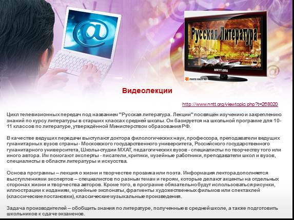 Цикл телевизионных передач под названием "Русская литература. Лекции" посвящён изучению и закреплению знаний по курсу литературы в старших классах средней школы. Он базируется на школьной программе для 10-11 классов по литературе, утверждённой Министерством образования РФ. В качестве ведущих передачи выступают доктора филологических наук, профессора, преподаватели ведущих гуманитарных вузов страны - Московского государственного университета, Российского государственного гуманитарного университета, Школы-студии МХАТ, педагогических вузов - специалисты по творчеству того или иного автора. Им помогают эксперты - писатели, критики, музейные работники, преподаватели школ и вузов, специалисты в области литературы и искусства. Основа программы – лекция о жизни и творчестве прозаика или поэта. Информация лектора дополняется выступлениями экспертов – специалистов по разным темам и героям, которые делают акценты на отдельных сторонах жизни и творчества авторов. Кроме того, в программе обязательно будут использоваться рисунки, иллюстрации к изданиям, музейные экспонаты, фрагменты художественных фильмов или спектаклей (классические постановки), классические музыкальные произведения. Задача производителей – обобщить знания по литературе, полученные в средней школе, а также подготовить школьников к сдаче экзаменов.