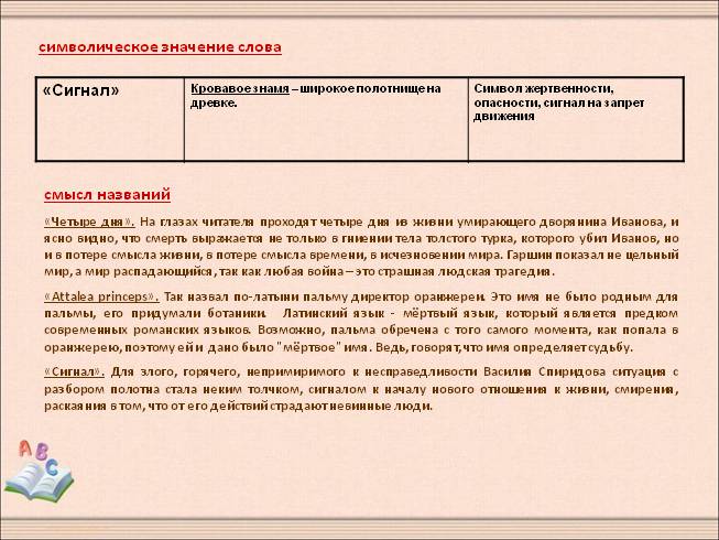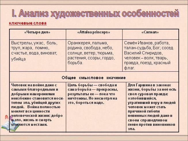 На примере рассказов «Четыре дня», «Сигнал» и сказки «Attalea princeps» выявить и проанализировать приёмы авторского самораскрытия, дающие нам право говорить о своеобразии гаршинского лиризма.