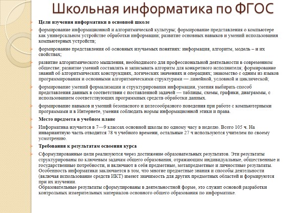 Информатика изучается в 7—9 классах основной школы по одному часу в неделю. Всего 105 ч. На инвариантную часть отводится 78 ч учебного времени, остальные 27 ч используются учителем по своему усмотрению.