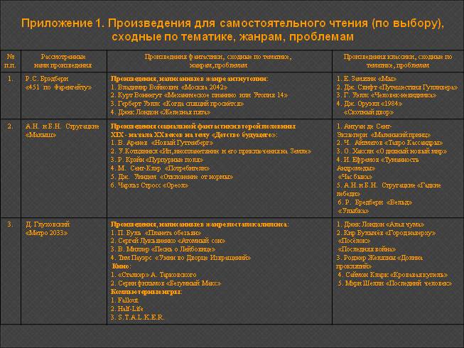 2. Сегодня классические произведения, наполненные глубокими идеями и истинными ценностями, уступают свои позиции однодневной, дешевой литературе. Изученные же нами произведения фантастики на порядок выше массовой литературы, потому что, как и классическая литература, они воспитывают своего читателя, учат вечным истинам, развивают в нём склонность мечтать о будущем, предостерегают о возможных ошибках человечества.