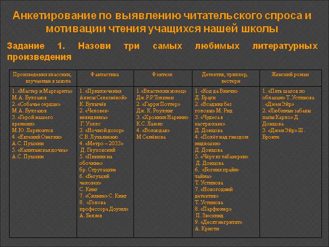 4. Провести анкетирование по выявлению читательского спроса и мотивации чтения учащихся нашей школы.