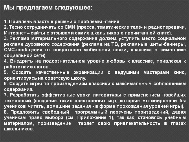 7. Разработать эффективные уроки литературы с применением новейших технологий (создание таких электронных игр, которые мотивировали бы учеников читать, домашние задания - в форме прохождения уровней игры).