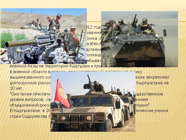 Кыргызский парламент 13 декабря 2012 года принял закон о ратификации соглашения о статусе и условиях пребывания объединенной российской военной базы на территории Кыргызкая Республика, а 19 декабря 2012 года его подписал президент Кыргызстана Алмазбек Атамбаев. 27 февраля 2013 Правительство России одобрило и представило президенту России Владимиру Путину для внесения на ратификацию соглашение между Россией и Кыргызстаном о статусе и условиях пребывания объединенной российской военной базы на территории Кыргызии и протокол о сотрудничестве обеих стран в военной области в период, предшествующий вступлению в силу вышеназванного соглашения. Положения соглашения и протокола закрепляют долгосрочное российское военное присутствие на территории Кыргызстана на 20 лет.