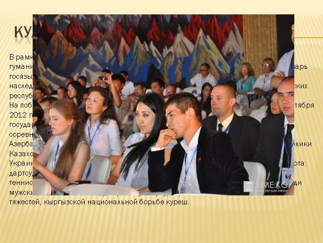 На побережье озера Иссык-Куль (Кыргызская Республика) в период с 4 по 12 сентября 2012 года при поддержке МФГС прошли VIII Международные спортивные игры государств – участников СНГ под девизом «В Содружестве – мир и здоровье». В соревнованиях, наряду с хозяевами, приняли участие спортсмены из Азербайджанской Республики, Республики Армения, Республики Беларусь, Республики Казахстан, Российской Федерации, Республики Таджикистан, Туркменистана и Украины. На 17 спортивных сооружениях прошли соревнования по 15 видам спорта: дартсу, легкой атлетике, мини-футболу, пляжному футболу, теннису, настольному теннису, плаванию, волейболу, пляжному волейболу, стритболу, армрестлингу (среди мужских и женских команд), гиревому спорту, перетягиванию каната, поднятию тяжестей, кыргызской национальной борьбе куреш.