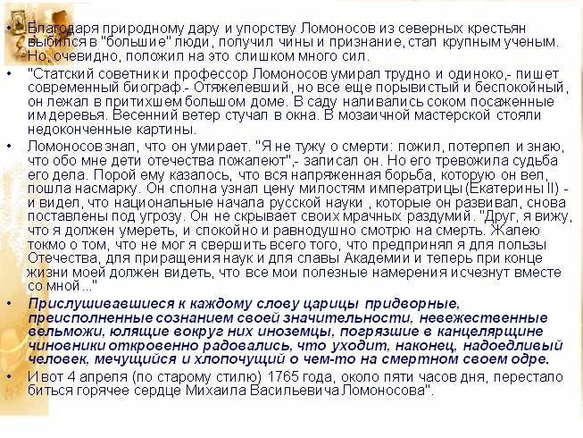Ломоносов знал, что он умирает. "Я не тужу о смерти: пожил, потерпел и знаю, что обо мне дети отечества пожалеют",- записал он. Но его тревожила судьба его дела. Порой ему казалось, что вся напряженная борьба, которую он вел, пошла насмарку. Он сполна узнал цену милостям императрицы (Екатерины II) - и видел, что национальные начала русской науки , которые он развивал, снова поставлены под угрозу. Он не скрывает своих мрачных раздумий. "Друг, я вижу, что я должен умереть, и спокойно и равнодушно смотрю на смерть. Жалею токмо о том, что не мог я свершить всего того, что предпринял я для пользы Отечества, для приращения наук и для славы Академии и теперь при конце жизни моей должен видеть, что все мои полезные намерения исчезнут вместе со мной..."