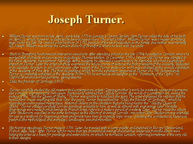 Back in Brentford, he showed an interest in visual arts.After attending school in the late 1780s he settled in London, where he worked with architects and surveyors, including to Thomas Malton. In December 1789 a 14-year-old Turner was admitted to the Royal Academy, his examiner Reynolds.At the academy he attended a recent lecture by Reynolds, who had a significant impact on Turner. Later the artist carefully examined the whole course of lectures the first president of the academy, dedicated to an idealistic direction in art.Just one year after receipt of the Turner watercolor work was exhibited at the annual exhibition of the Academy of Fine Arts. The first oil painting, which won the exhibition appeared at Turner in 1790. Subsequently, Turner is constantly exhibited at the Academy.From 1791 he worked as set designer in the "Pantheon of the Opera" on Oxford Street and worked part time, giving lessons.