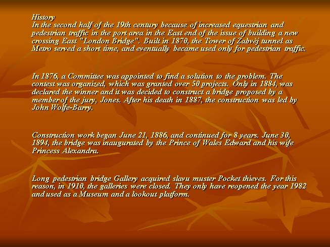 History In the second half of the 19th century because of increased equestrian and pedestrian traffic in the port area in the East end of the issue of building a new crossing East "London Bridge". Built in 1870, the Tower of Zabvèj tunnel as Metro served a short time, and eventually became used only for pedestrian traffic.