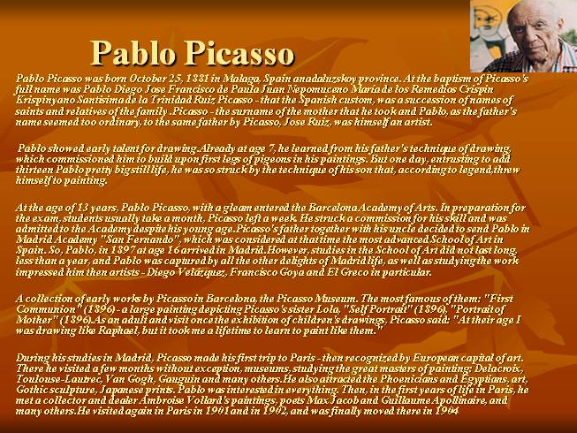 Pablo Picasso was born October 25, 1881 in Malaga, Spain anadaluzskoy province. At the baptism of Picasso's full name was Pablo Diego Jose Francisco de Paula Juan Nepomuceno María de los Remedios Crispin Krispinyano Santisima de la Trinidad Ruiz Picasso - that the Spanish custom, was a succession of names of saints and relatives of the family .Picasso - the surname of the mother that he took and Pablo, as the father's name seemed too ordinary, to the same father by Picasso, Jose Ruiz, was himself an artist.