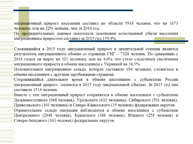 миграционный прирост населения составил по области 5918 человек, что на 1673 человека, или на 22% меньше, чем за 2014 год.