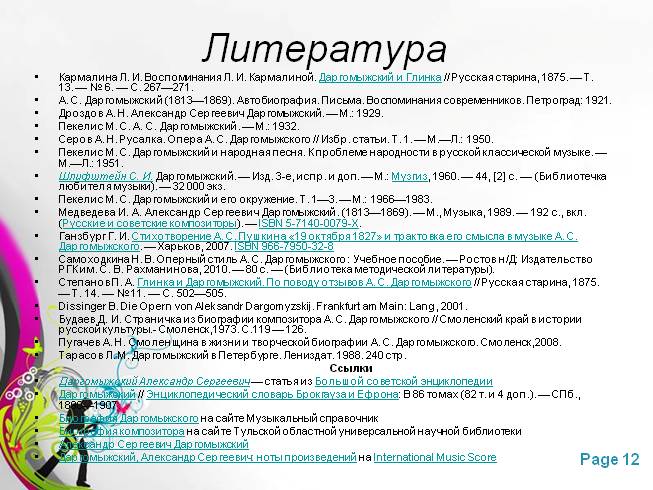 Медведева И. А. Александр Сергеевич Даргомыжский. (1813—1869). — М., Музыка, 1989. — 192 с., вкл. (Русские и советские композиторы). — ISBN 5-7140-0079-X.