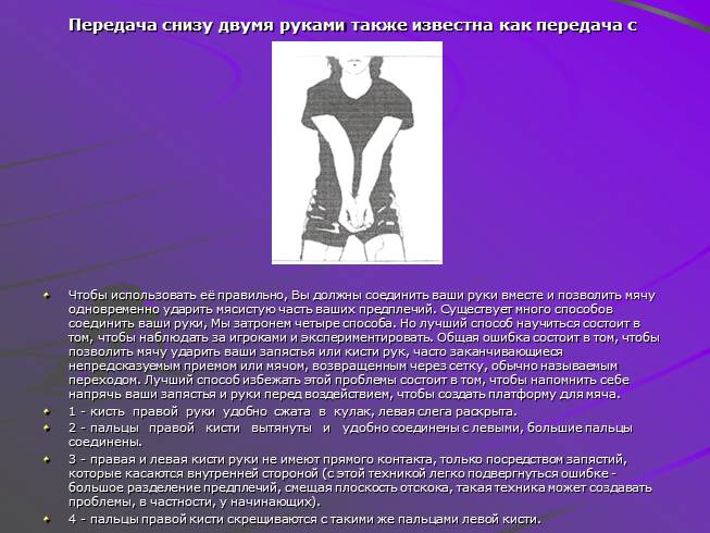 5. Перед передачей руки, согнутые в локтях, кратчайшим путем выносятся вверх. Кисти чуть выше головы. Локти на уровне плечевого сустава, или чуть выше. Расстояние между локтями определяется свободным положением мышц плечевого пояса (для контроля расслабленную руку игрока взять за запястье и поднять до исходного положения).
