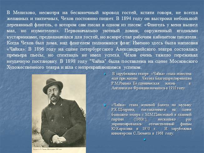 Надо сказать, что новаторство пьес Чехова не сразу было понято и оценено по достоинству, чем, в частности, объясняется провал премьеры «Чайки» на сцене