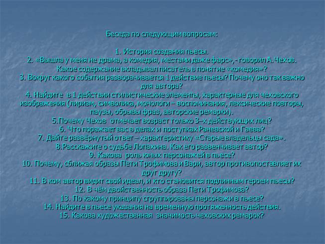 Беседа по следующим вопросам: 1. История создания пьесы. 2. «Вышла у меня не драма, а комедия, местами даже фарс»,- говорил А.Чехов. Какое содержание вкладывал писатель в понятие «комедия»? 3. Вокруг какого события разворачивается 1 действие пьесы? Почему оно так важно для автора? 4. Найдите в 1 действии стилистические элементы, характерные для чеховского изображения (лиризм, символика, монологи – воспоминания, лексические повторы, паузы, обрывы фраз, авторские ремарки). 5.Почему Чехов отмечает возраст только 3–х действующих лиц? 6. Что поражает вас в делах и поступках Раневской и Гаева? 7. Дайте развёрнутый ответ – характеристику «Старые владельцы сада». 8.Расскажите о судьбе Лопахина. Как его развенчивает автор? 9. Какова роль юных персонажей в пьесе? 10. Почему, сближая образы Пети Трофимова и Вари, автор противопоставляет их друг другу? 11. В ком автор видит свой идеал, и кто становится подлинным героем пьесы? 12. В чём двойственность образа Пети Трофимова? 13. По какому принципу сгруппированы персонажи в пьесе? 14. Найдите в пьесе указания на временную протяженность действия. 15. Какова художественная значимость чеховских ремарок?