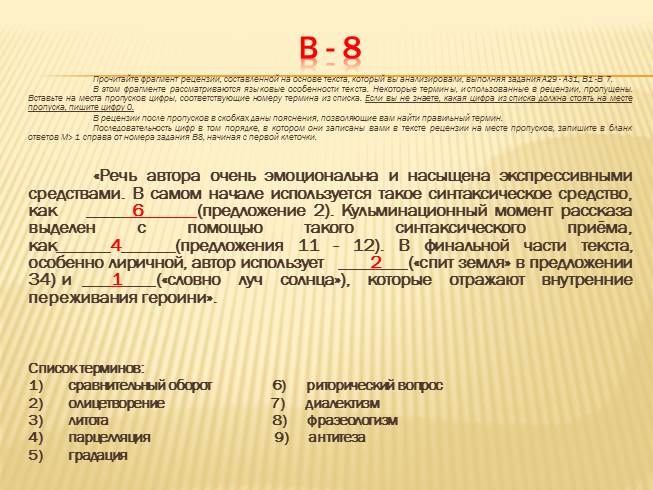 В этом фрагменте рассматриваются языковые особенности текста. Некоторые термины, использованные в рецензии, пропущены. Вставьте на места пропусков цифры, соответствующие номеру термина из списка. Если вы не знаете, какая цифра из списка должна стоять на месте пропуска, пишите цифру 0.