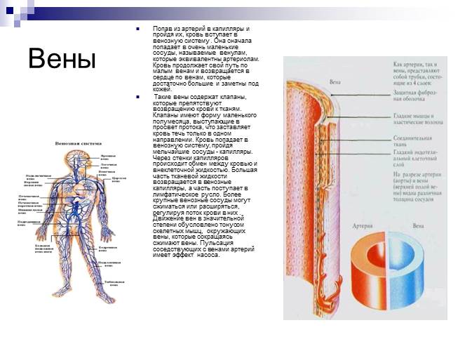 Такие вены содержат клапаны, которые препятствуют возвращению крови к тканям. Клапаны имеют форму маленького полумесяца, выступающие в просвет протока, что заставляет кровь течь только в одном направлении. Кровь попадает в венозную систему, пройдя мельчайшие сосуды - капилляры. Через стенки капилляров происходит обмен между кровью и внеклеточной жидкостью. Большая часть тканевой жидкости возвращается в венозные капилляры, а часть поступает в лимфатическое русло. Более крупные венозные сосуды могут сжиматься или расширяться, регулируя поток крови в них . Движение вен в значительной степени обусловлено тонусом скелетных мышц, окружающих вены, которые сокращаясь сжимают вены. Пульсация соседствующих с венами артерий имеет эффект насоса.