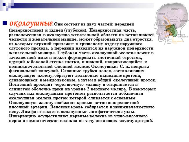 околоушные. Они состоят из двух частей: передней (поверхностной) и задней (глубокой). Поверхностная часть, расположенная в околоушно-жевательной области на ветви нижней челюсти и жевательной мышце, может образовывать два отростка, из которых верхний прилежит к хрящевому отделу наружного слухового прохода, а передний находится на наружной поверхности жевательной мышцы. Глубокая часть околоушной железы лежит в зачелюстной ямке и может формировать глоточный отросток, идущий к боковой стенке глотки, и нижний, направляющийся к поднижнечелюстной слюнной железе. Околоушная С. ж. покрыта фасциальной капсулой. Слюнные трубки долек, составляющих околоушную железу, образуют дольковые выводные протоки, сливающиеся в междольковые, а затем в общий околоушной проток. Последний проходит через щечную мышцу и открывается в слизистой оболочке щеки на уровне 2 верхнего моляра. В некоторых случаях над околоушным протоком располагается добавочная околоушная железа, проток которой сливается с основным. Околоушную железу снабжают кровью ветви поверхностной височной артерии. Венозная кровь собирается в занижнечелюстную вену. Лимфа оттекает в околоушные лимфатические узлы. Иннервацию осуществляют нервные волокна из ушно-височного нерва и симпатические волокна по ходу питающих железу артерий.