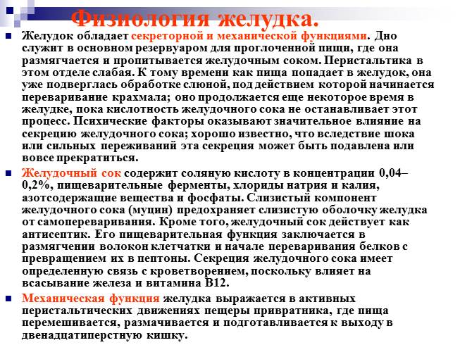 Желудок обладает секреторной и механической функциями. Дно служит в основном резервуаром для проглоченной пищи, где она размягчается и пропитывается желудочным соком. Перистальтика в этом отделе слабая. К тому времени как пища попадает в желудок, она уже подверглась обработке слюной, под действием которой начинается переваривание крахмала; оно продолжается еще некоторое время в желудке, пока кислотность желудочного сока не останавливает этот процесс. Психические факторы оказывают значительное влияние на секрецию желудочного сока; хорошо известно, что вследствие шока или сильных переживаний эта секреция может быть подавлена или вовсе прекратиться.