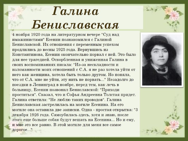 4 ноября 1920 года на литературном вечере "Суд над имажинистами" Есенин познакомился с Галиной Бениславской. Их отношения с переменным успехом продлились до весны 1925 года. Вернувшись из Константинова, Есенин окончательно порвал с ней. Это было для нее трагедией. Оскорбленная и униженная Галина в своих воспоминаниях писала: "Из-за нескладности и изломанности моих отношений с С.А. я не раз хотела уйти от него как женщина, хотела быть только другом. Но поняла, что от С.А. мне не уйти, эту нить не порвать..." Незадолго до поездки в Ленинград в ноябре, перед тем, как лечь в больницу, Есенин позвонил Бениславской: "Приходи проститься". Сказал, что и Софья Андреевна Толстая придет. Галина ответила: "Не люблю таких проводов". Галина Бениславская застрелилась на могиле Есенина. На его могиле она оставила две записки. Одна - простая открытка: "3 декабря 1926 года. Самоубилась здесь, хотя и знаю, после этого еще больше собак будут вешать на Есенина... Но и ему, и мне это все равно. В этой могиле для меня все самое дорогое..."