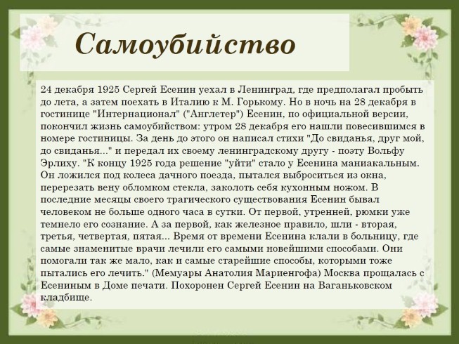 24 декабря 1925 Сергей Есенин уехал в Ленинград, где предполагал пробыть до лета, а затем поехать в Италию к М. Горькому. Но в ночь на 28 декабря в гостинице "Интернационал" ("Англетер") Есенин, по официальной версии, покончил жизнь самоубийством: утром 28 декабря его нашли повесившимся в номере гостиницы. За день до этого он написал стихи "До свиданья, друг мой, до свиданья..." и передал их своему ленинградскому другу - поэту Вольфу Эрлиху. "К концу 1925 года решение "уйти" стало у Есенина маниакальным. Он ложился под колеса дачного поезда, пытался выброситься из окна, перерезать вену обломком стекла, заколоть себя кухонным ножом. В последние месяцы своего трагического существования Есенин бывал человеком не больше одного часа в сутки. От первой, утренней, рюмки уже темнело его сознание. А за первой, как железное правило, шли - вторая, третья, четвертая, пятая... Время от времени Есенина клали в больницу, где самые знаменитые врачи лечили его самыми новейшими способами. Они помогали так же мало, как и самые старейшие способы, которыми тоже пытались его лечить." (Мемуары Анатолия Мариенгофа) Москва прощалась с Есениным в Доме печати. Похоронен Сергей Есенин на Ваганьковском кладбище.