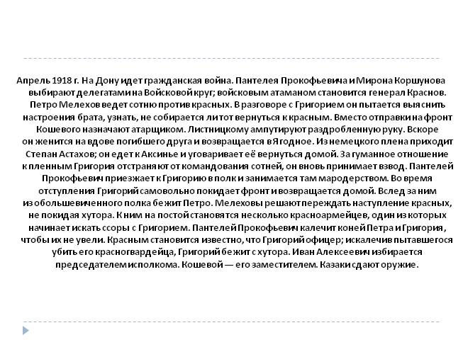 Иван Алексеевич, Митька Коршунов, Прохор Зыков, а вслед за ними бежавший из обольшевиченного полка Петро Мелехов возвращаются в станицу. Григорий перешел на сторону большевиков, будучи уже в чине взводного офицера. После переворота он получает назначение на должность командира сотни