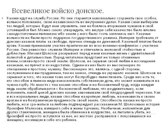 Казаки идут на службу России. Но они стараются максимально сохранить свое особое, вольное положение, свою независимость во внутренних делах. Казаки сами выбирали тех людей, которые будут ими управлять, они не боялись вторжения чужаков в свой устоявшийся быт. Можно смело утверждать, что внутри себя казачество было вполне самодостаточным явлением; ибо земли у него было «хоть заглонись ею». Казачьи вольности не были просто подарком государственного режима. Империя требовала от донских казаков платы за свободы, причем отнюдь не денежной. Казачьей платою была кровь. Казаки принимали участие практически во всех военных конфликтах с участием России. Они ревностно служили Империи и отличались железной стойкостью и доблестью. Михаил Шолохов раскрывает перед нами казачью жизнь с удивительной полнотой и детальностью. Перед читателем предстают не только отчаянные воины,хозяева просто своей земли. Шолохов, не скрывая своей любви и восхищения казаками, не прячет и их недостатки. Одним из них было их высокомерие по отношению к простому мужику. Высокомерие это, являясь, с одной стороны, заслуженным и выстраданным, тем не менее, отнюдь не украшало казаков. Шолохов не скрывает и того, что казаки тоже могут беспробудно пьянствовать. Среди них есть те, кто способен в пьяном виде изнасиловать собственную дочь, кто может наживаться на чужом горбу. Но вместе с тем казаки способны и на беззаветный труд, когда каждая пядь земли обрабатывается с бесконечной любовью, что неудивительно, если вспомнить, какой ценой донские казаки завоевывали свой плодородный чернозем. Как и все нормальные люди, казаки способны на крепкую любовь, на ненависть к своим врагам и на безграничную преданность своей земле. Способность казака не просто любить, но и сражаться за любовь подтверждает рассказанная М. Шолоховым история Прокофия Мелехова, взявшего себе в жены турчанку. Необычная, непонятная для других станичников, женщина была обвинена в колдовстве, ее пытались убить, но Прокофий не просто вступился за нее, но жестоко расправился с покусившимся на женщину, носившую в себе его ребенка.