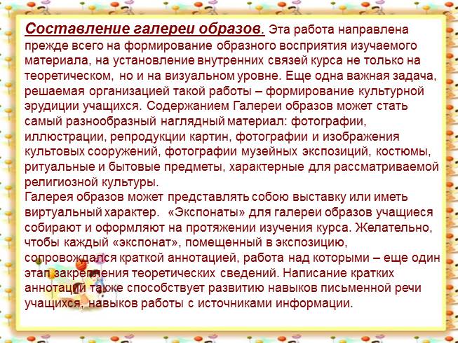Составление галереи образов. Эта работа направлена прежде всего на формирование образного восприятия изучаемого материала, на установление внутренних связей курса не только на теоретическом, но и на визуальном уровне. Еще одна важная задача, решаемая организацией такой работы – формирование культурной эрудиции учащихся. Содержанием Галереи образов может стать самый разнообразный наглядный материал: фотографии, иллюстрации, репродукции картин, фотографии и изображения культовых сооружений, фотографии музейных экспозиций, костюмы, ритуальные и бытовые предметы, характерные для рассматриваемой религиозной культуры.