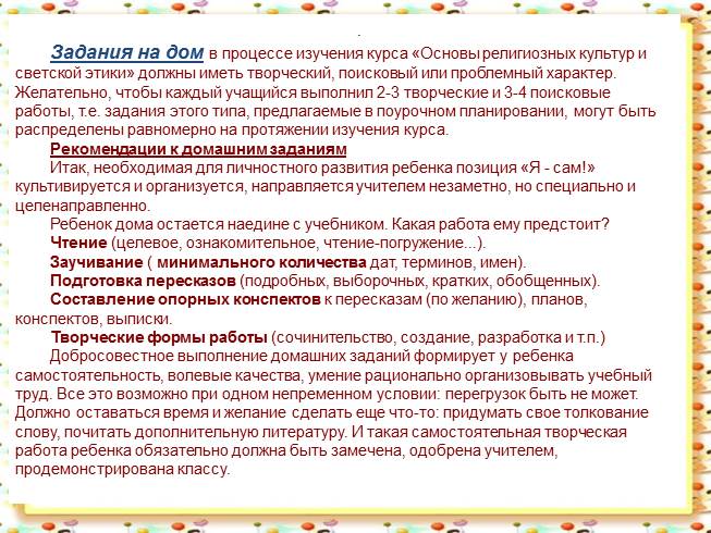 Задания на дом в процессе изучения курса «Основы религиозных культур и светской этики» должны иметь творческий, поисковый или проблемный характер. Желательно, чтобы каждый учащийся выполнил 2-3 творческие и 3-4 поисковые работы, т.е. задания этого типа, предлагаемые в поурочном планировании, могут быть распределены равномерно на протяжении изучения курса.