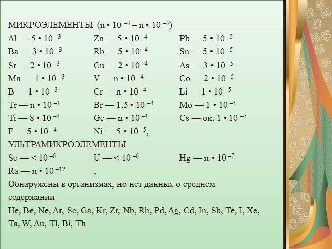 МИКРОЭЛЕМЕНТЫ (n • 10 –3 – n • 10 –5) МИКРОЭЛЕМЕНТЫ (n • 10 –3 – n • 10 –5) МИКРОЭЛЕМЕНТЫ (n • 10 –3 – n • 10 –5)