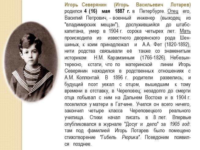 Игорь Северянин (Игорь Васильевич Лотарев) родился 4 (16) мая 1887 г. в Петербурге. Отец его, Василий Петрович, - военный инженер (выходец из "владимирских мещан"), дослужившийся до штабс-капитана, умер в 1904 г. сорока четырех лет. Мать происходила из известного дворянского рода Шен-шиных, к коим принадлежал и А.А. Фет (1820-1892), нити родства связывали её также со знаменитым историком Н.М. Карамзиным (1766-1826). Небезын-тересно, кстати, что по материнской линии Игорь Северянин находился в родственных отношениях с А.М. Коллонтай. В 1896 г. родители развелись, и будущий поэт уехал с отцом, вышедшим к тому времени в отставку, в Череповец; незадолго до смерти отца побывал с ним на Дальнем Востоке и в 1904 г. поселился у матери в Гатчине. Учился он всего ничего, закончил четыре класса Череповецкого реального училища. Стихи начал писать в 8 лет. Впервые опубликовался в журнале "Досуг и дело" за 1905 год: там под фамилией Игорь Лотарев было помещено стихотворение "Гибель Рюрика". Псевдоним появил-ся позднее.