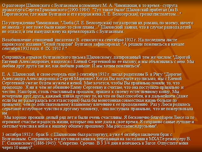 О разговоре Шиловского с Булгаковым вспоминает М. А. Чимишкиан, в то время - супруга драматурга Сергея Ермолинского (1900-1984): "Тут такое было! Шиловский прибегал (на Б. Пироговскую, где жили Булгаков и его вторая жена Л. Е. Белозерская), грозил пистолетом..." По утверждению Чимишкиан, "Люба (Л. Е. Белозерская) тогда против их романа, по-моему, ничего не имела - у нее тоже были какие-то свои планы..." Шиловский заявил, что в случае развода детей не отдаст, и тем вынудил жену на время порвать с Булгаковым. Возобновление отношений писателя с Б. относится к сентябрю 1932 г. На последнем листе парижского издания "Белой гвардии" Булгаков зафиксировал: "А решили пожениться в начале сентября 1932 года. 6. IX. 1932 г." Сохранился отрывок булгаковского письма Шиловскому, датированный тем же числом: "Дорогой Евгений Александрович, я виделся с Еленой Сергеевной по ее вызову, и мы объяснились с нею. Мы любим друг друга так же, как любили раньше. И мы хотим пожениться". Е. А. Шиловский, в свою очередь еще 3 сентября 1932 г. писал родителям Б. в Ригу: "Дорогие Александра Александровна и Сергей Маркович! Когда Вы получите это письмо, мы с Еленой Сергеевной уже не будем мужем и женой. Мне хочется, чтобы Вы правильно поняли то, что произошло. Я ни в чем не обвиняю Елену Сергеевну и считаю, что она поступила правильно и честно. Наш брак, столь счастливый в прошлом, пришел к своему естественному концу. Мы исчерпали друг друга, каждый, давая другому то, на что он был способен, и в дальнейшем (даже если бы не разыгралась вся эта история) была бы монотонная совместная жизнь больше по привычке, чем по действительному взаимному влечению к ее продолжению. Раз у Люси родилось серьезное и глубокое чувство к другому человеку, - она поступила правильно, что не пожертвовала им. Мы хорошо прожили целый ряд лет и были очень счастливы. Я бесконечно благодарен Люсе за то огромное счастье и радость жизни, которые она мне дала в свое время. Я сохраняю самые лучшие и светлые чувства к ней и к нашему общему прошлому. Мы расстаемся друзьями". 3 октября 1932 г. брак Б. с Шиловским был расторгнут, а уже 4 октября заключен брак с Булгаковым. Сохранилась его шутливая записка, переданная на заседании в МХАТе режиссеру В. Г. Сахновскому (1886-1945): "Секретно. Срочно. В 3 3/4 дня я венчаюсь в Загсе. Отпустите меня через 10 минут".