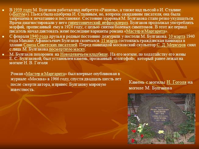 В 1939 году М. Булгаков работал над либретто «Рашель», а также над пьесой о И. Сталине («Батум»). Пьеса была одобрена И. Сталиным, но, вопреки ожиданиям писателя, она была запрещена к печатанию и постановке. Состояние здоровья М. Булгакова стало резко ухудшаться. Врачи диагностировали у него гипертонический нефросклероз. Булгаков продолжал употреблять морфий, прописанный ему в 1924 году, с целью снятия болевых симптомов. В этот же период писатель начал диктовать жене последние варианты романа «Мастер и Маргарита».