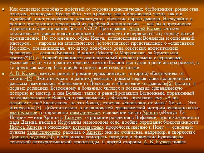 Как следствие подобных действий со стороны воинствующих безбожников роман стал ответом, отповедью. Неслучайно, что в романе, как в московской части, так и в иудейской, идет своеобразное карикатурное обеление образа дьявола. Неслучайно в романе присутствие персонажей из еврейской демонологии — как бы в противовес отрицанию существования Бога в СССР. Протодьякон Андрей Кураев считает «пилатовские главы» кощунственными, но советует не переносить эту оценку на всё произведение. По его мнению, образ Иешуа, вдохновлённый Воландом и описанный мастером, — пародия на атеистическое (и толстовское) представление о «сладеньком Исусике», показывающая, что автор подобного рода советских атеистических брошюрок — сатана (Воланд). В книге «Мастер и Маргарита»: за Христа или против?"[4] о. Андрей сравнивает окончательный вариант романа с черновыми, указывая на то, что в ранних версиях именно Воланд выступал в роли автора романа, в то время как мастер был введён в роман значительно позже.