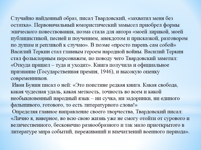 Случайно найденный образ, писал Твардовский, «захватил меня без остатка». Первоначальный юмористический замысел приобрел формы эпического повествования, поэма стала для автора «моей лирикой, моей публицистикой, песней и поучением, анекдотом и присказкой, разговором по душам и репликой к случаю». В поэме «просто парень сам собой» Василий Теркин стал главным героем народной войны. Василий Теркин стал фольклорным персонажем, по поводу чего Твардовский заметил: «Откуда пришел – туда и уходит». Книга получила и официальное признание (Государственная премия, 1946), и высокую оценку современников.
