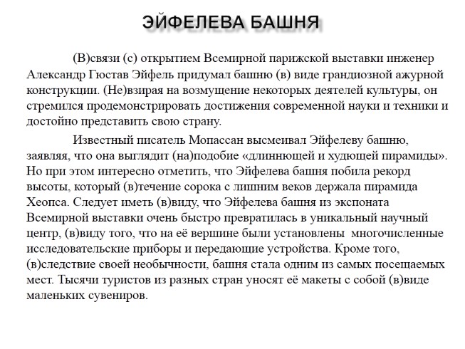 (В)связи (с) открытием Всемирной парижской выставки инженер Александр Гюстав Эйфель придумал башню (в) виде грандиозной ажурной конструкции. (Не)взирая на возмущение некоторых деятелей культуры, он стремился продемонстрировать достижения современной науки и техники и достойно представить свою страну.