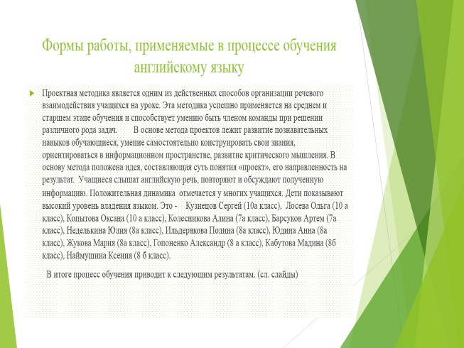 Проектная методика является одним из действенных способов организации речевого взаимодействия учащихся на уроке. Эта методика успешно применяется на среднем и старшем этапе обучения и способствует умению быть членом команды при решении различного рода задач. В основе метода проектов лежит развитие познавательных навыков обучающиеся, умение самостоятельно конструировать свои знания, ориентироваться в информационном пространстве, развитие критического мышления. В основу метода положена идея, составляющая суть понятия «проект», его направленность на результат. Учащиеся слышат английскую речь, повторяют и обсуждают полученную информацию. Положительная динамика отмечается у многих учащихся. Дети показывают высокий уровень владения языком. Это - Кузнецов Сергей (10а класс), Лосева Ольга (10 а класс), Копытова Оксана (10 а класс), Колесникова Алина (7а класс), Барсуков Артем (7а класс), Неделькина Юлия (8а класс), Ильдерякова Полина (8а класс), Юдина Анна (8а класс), Жукова Мария (8а класс), Гопоненко Александр (8 а класс), Кабутова Мадина (8б класс), Наймушина Ксения (8 б класс).