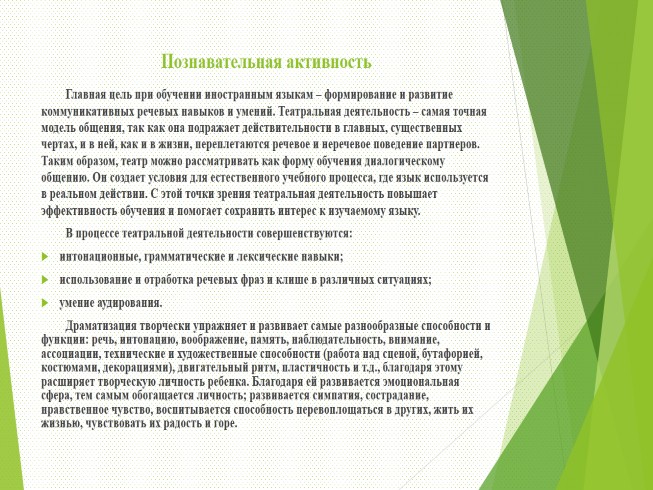 Главная цель при обучении иностранным языкам – формирование и развитие коммуникативных речевых навыков и умений. Театральная деятельность – самая точная модель общения, так как она подражает действительности в главных, существенных чертах, и в ней, как и в жизни, переплетаются речевое и неречевое поведение партнеров. Таким образом, театр можно рассматривать как форму обучения диалогическому общению. Он создает условия для естественного учебного процесса, где язык используется в реальном действии. С этой точки зрения театральная деятельность повышает эффективность обучения и помогает сохранить интерес к изучаемому языку.