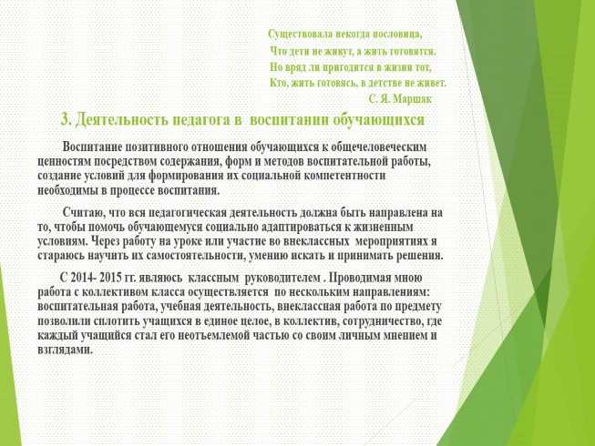 Существовала некогда пословица, Что дети не живут, а жить готовятся. Но вряд ли пригодится в жизни тот, Кто, жить готовясь, в детстве не живет. С. Я. Маршак 3. Деятельность педагога в воспитании обучающихся