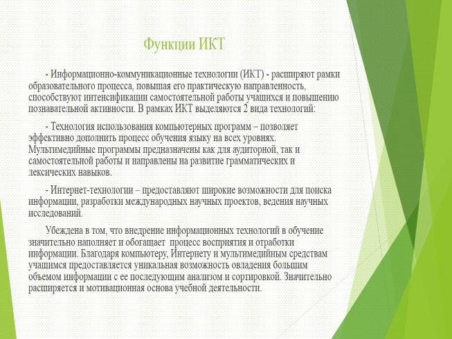 В процессе применения учителем информационных технологий обучающиеся реализуют творческие виды деятельности, что включает умения расспрашивать, объяснять, изучать, описывать, сравнивать, анализировать, оценивать, высказывать свои мнения и суждения, аргументировать их, проводить самостоятельный поиск необходимой информации, ориентироваться в тексте на английском языке, делать краткие сообщения на заданную тему.