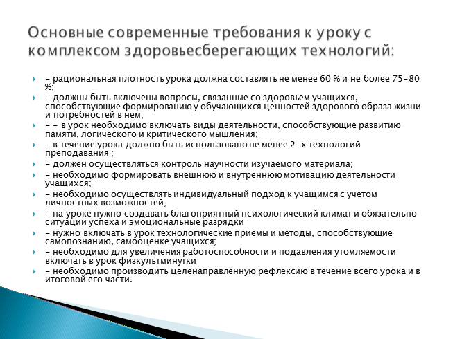 Основные современные требования к уроку с комплексом здоровьесберегающих технологий: