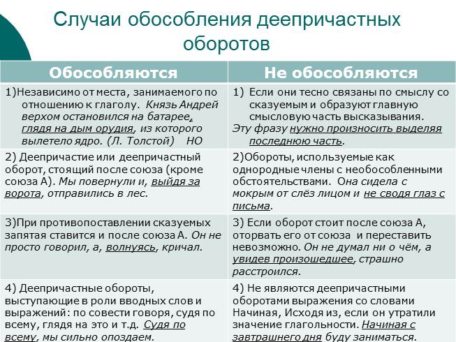 4) Деепричастные обороты, выступающие в роли вводных слов и выражений: по совести говоря, судя по всему, глядя на это и т.д. Судя по всему, мы сильно опоздаем. 4) Не являются деепричастными оборотами выражения со словами Начиная, Исходя из, если он утратили значение глагольности. Начиная с завтрашнего дня буду заниматься.