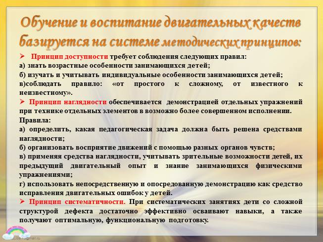 Обучение и воспитание двигательных качеств базируется на системе методических принципов: