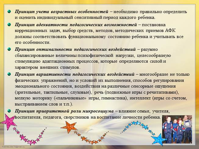 Принцип адекватности педагогических возможностей – постановка коррекционных задач, выбор средств, методов, методических приемов АФК должны соответствовать функциональному состоянию ребенка и учитывать все его особенности.