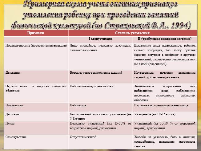 Примерная схема учета внешних признаков утомления ребенка при проведении занятий физической культурой (по Страховской В.Л., 1994)